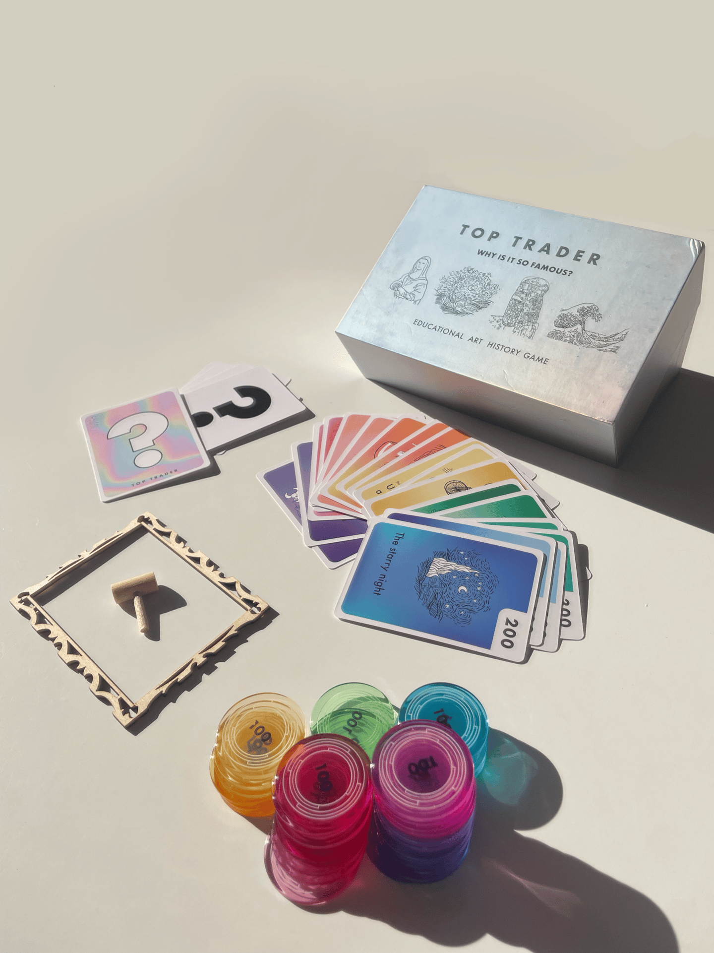 Top Trader es un juego de mesa bilingüe (inglés y español) de ritmo rápido en el que los jugadores se convierten en coleccionistas de arte que compiten por crear la colección más valiosa. A través de la gestión de recursos, subastas y negociaciones inteligentes, los jugadores exploran la historia del arte, desde los clásicos hasta las obras maestras contemporáneas.